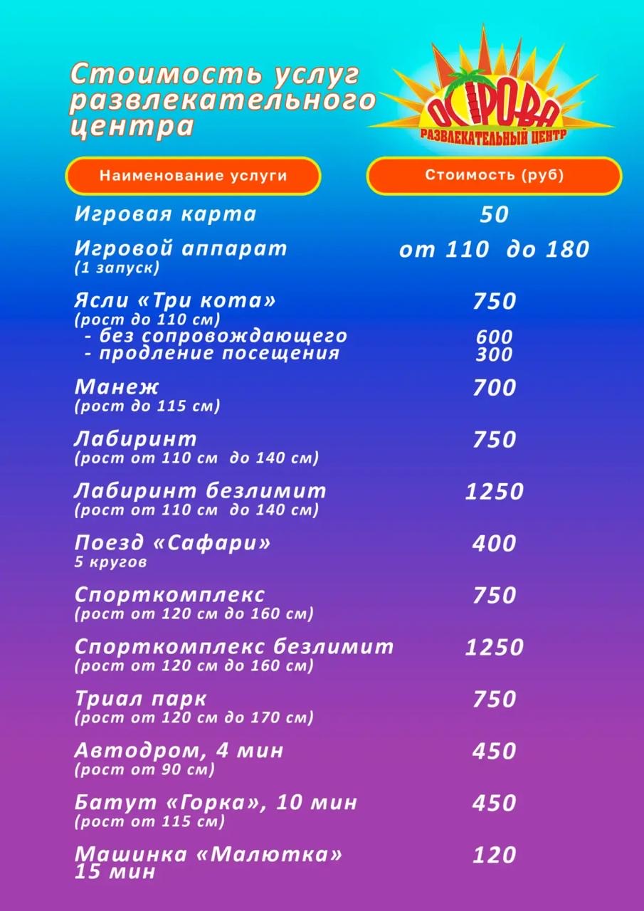 прайс на услуги развлекательного центра.